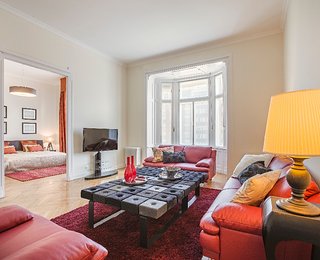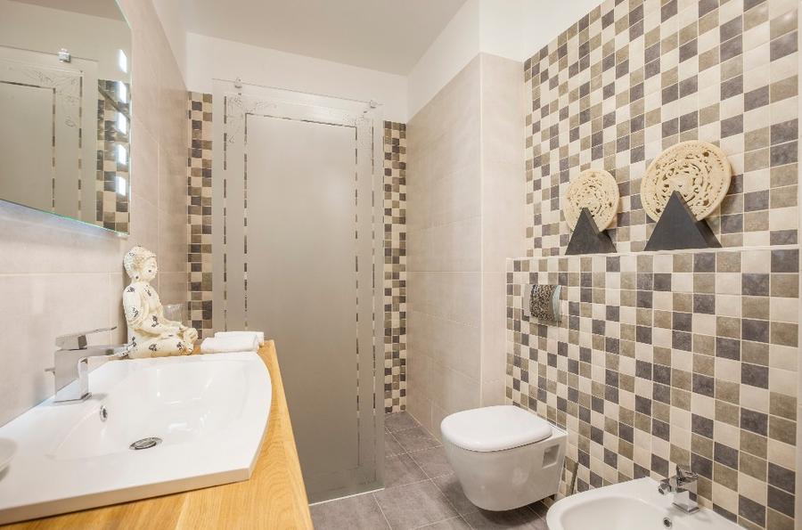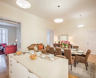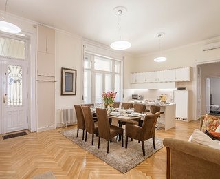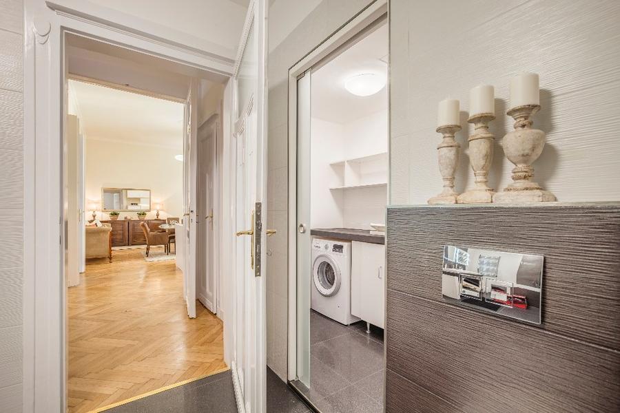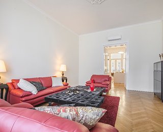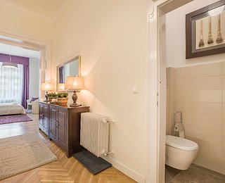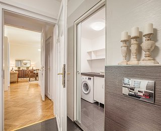 The first apartment has an ideal spatial structure and 132 m2 floor space. Entering the apartment, a light and spacious living room opens up, which also contains a brand new kitchen in the same space with full furnishings (built in cooker, fridge) and a dining area. The apartment has 3 sunny and large bedrooms with shutters, looking onto the street. Furthermore, the apartment has three toilets and two bathrooms. One of the bathrooms is adjacent to the first room with a shower and a sink. The other bathroom has a bath and a shower, as well as tow sinks. A laundry room, equipped with a washing machine, a sink and a dryer, opens and is separated from the bathroom by a glass sliding door.