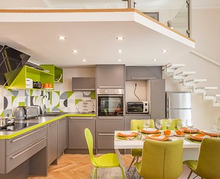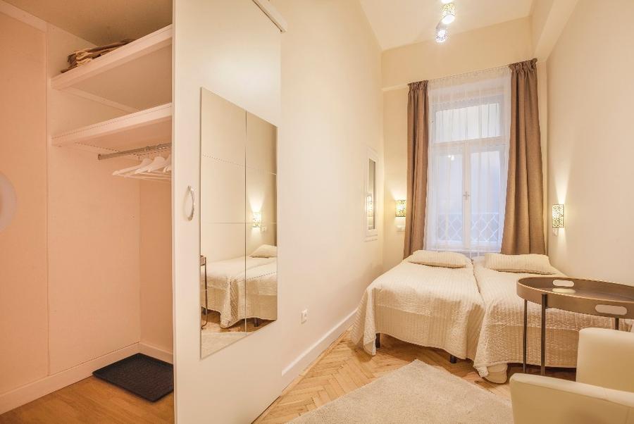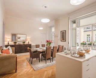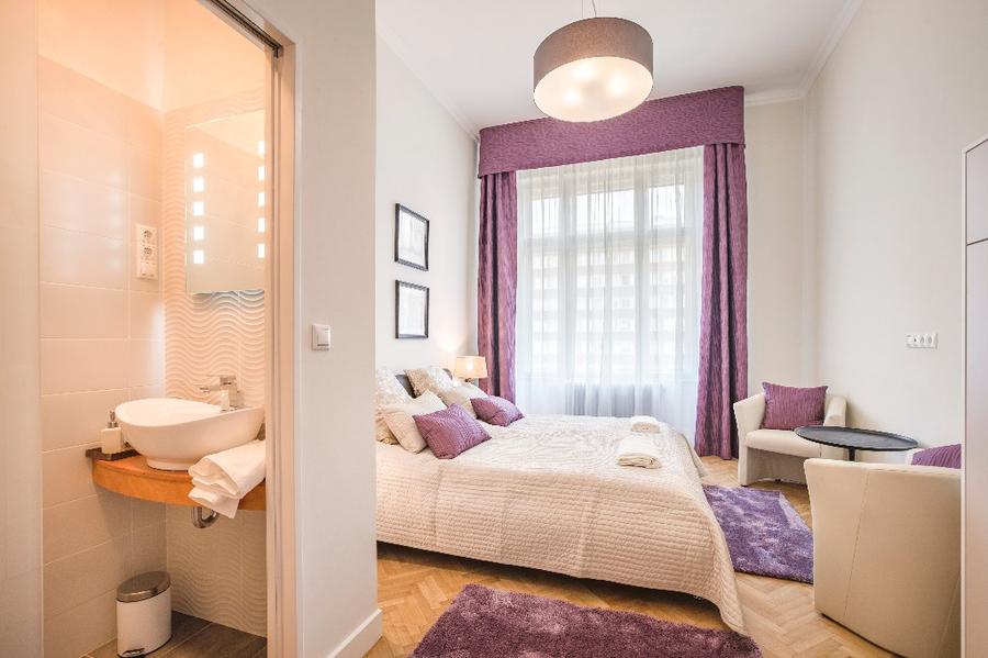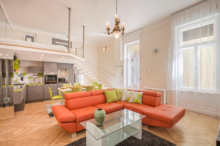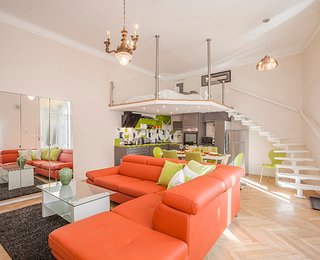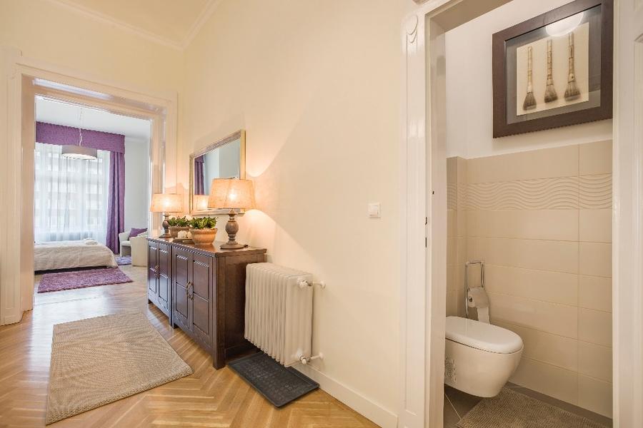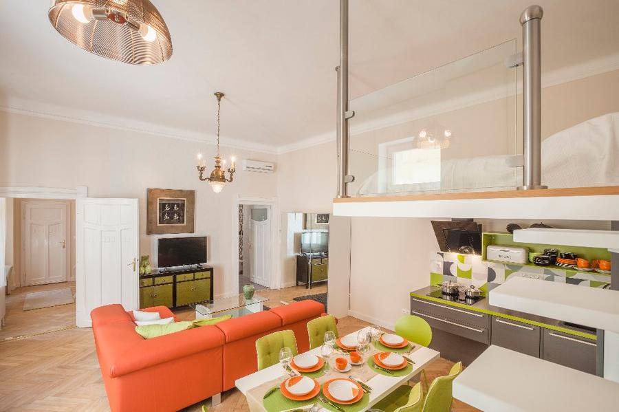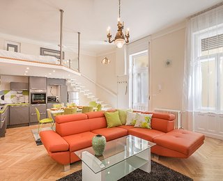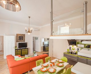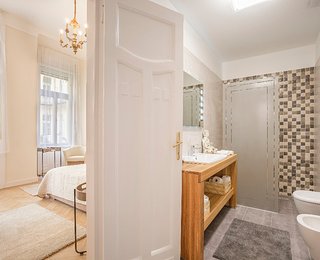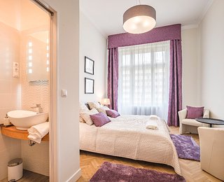 The second apartment has 60 m2 floor space. Its unique feature is a cosy bedroom-gallery that can be accessed comfortably via stairs from the light, fully equipped kitchen - diner. An individual elegant, classical bedroom opens from the living room, leading to the elegantly equipped bathroom. The bathroom is also accessibly from the living room.
